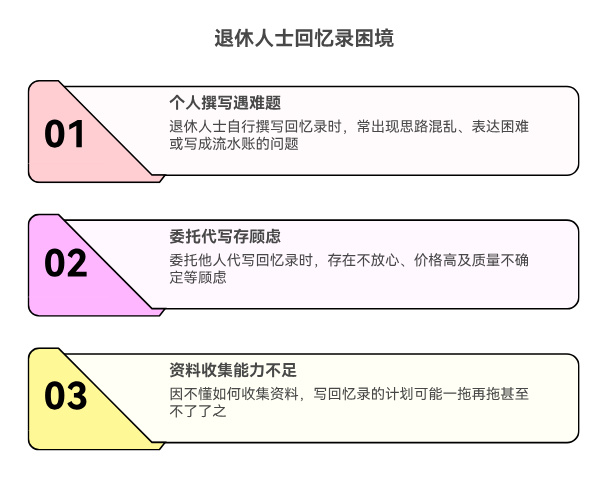很多退休人士一開始很有信心,準(zhǔn)備自己寫回憶錄,但寫著寫著就亂了,不知道要寫什么,茶壺倒餃子——出不來,或者就是流水賬,自己看都覺得沒意思;找人代寫回憶錄吧,一是不放心,二是價(jià)格也不低,還不知能不能寫好,就這樣,由于不懂如何收集資料,寫回憶錄的事可能一拖再拖,不了了之的大有人在,原因在哪里呢?