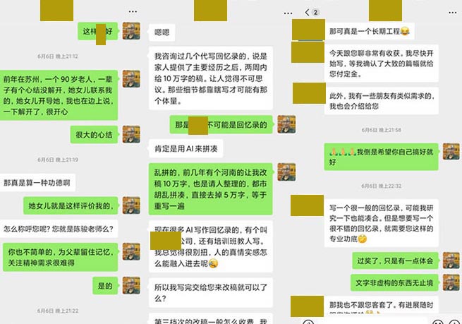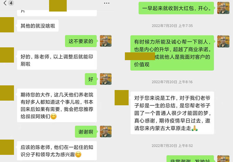 “對于您來說是工作,對于我們老爺子卻是一生的總結(jié),是您幫老爺子圓了一個普通人很少才能圓的夢,真心感謝,期待疫情早日過去,邀請您來內(nèi)蒙古大草原走走。陳老師,我一會兒給您發(fā)一下快遞地址,等印刷出來您直接順豐快遞就好,感謝陳老師給老爺子做的事兒,我想老爺子在生日的時候收到回憶錄會非常幸福。”