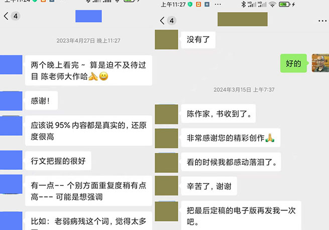 “陳作家,書收到了。非常感謝您的創(chuàng)作,看的時候我都感動落淚了。辛苦了,謝謝。把定稿的電子版再發(fā)我。”