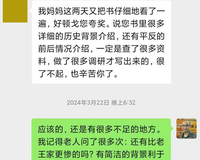 (2024年3月22日 下午)王岫巖女兒:“我媽媽這兩天又把書仔細(xì)地看了一遍,好頓戈您夸獎。說您書里很多詳細(xì)的歷史背景介紹,還有平反的前后情況介紹,一定是查了很多資料,做了很多調(diào)研才寫出來的……也辛苦你了。”
