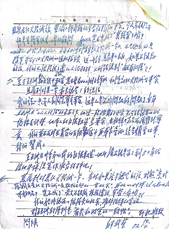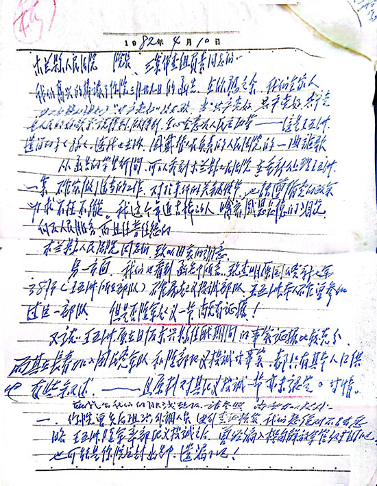 “到1982年年底,大規(guī)模的平反冤假錯案工作基本結(jié)束。使在這樣有利的大環(huán)境下,我爸能不能平反,何時平反,平反到什么程度,其實都要有‘關(guān)系’,我的‘關(guān)系’就是大姑父。沒有大姑父的努力,父親不太可能平反?,F(xiàn)在我們還保存著1982年4月10日、4月15日、10月12日,大姑父授意,我媽邱武榮抄寫,以王五洲遺孀名義申訴的三封申訴書。雖然字跡潦草,有刪除、添加涂改,個別鋼筆字已經(jīng)看不清,仍能清晰反映出我爸在長春解放前后一段時期的完整經(jīng)歷軌跡。同時也能看到,在上世紀(jì)80年代初轟轟烈烈的撥亂反正、平反冤假錯案中,個人申訴的艱難性和復(fù)雜性。”
