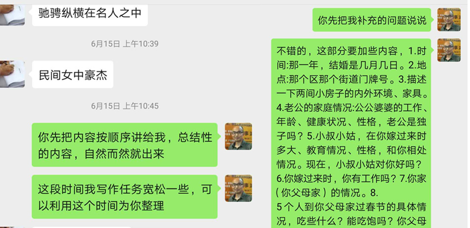 你好,我是開寫傳記創(chuàng)始人陳老師,我正在為一位山東的老太太代寫回憶錄。這位老太太69歲,文化水平不高,但很有見地,一輩子吃過很多苦,凡事有自己的觀點。開始,只是向我請教凡夫俗子,不是名人能不能寫書,然后,打電話給我,問我:自己的回憶錄怎么寫。她還說要以莫言為榜樣呢,自己寫自己的回憶錄。不過,說起來容易,下筆寫就難了,最后還是讓我代寫。我讓她先說說家庭起源和童年故事。她講了很多,不過缺少時代背景和時間地點,反過來,我再次提問,才能完成基本的回憶錄素材。她和我的交流,都是通過微信進(jìn)行。